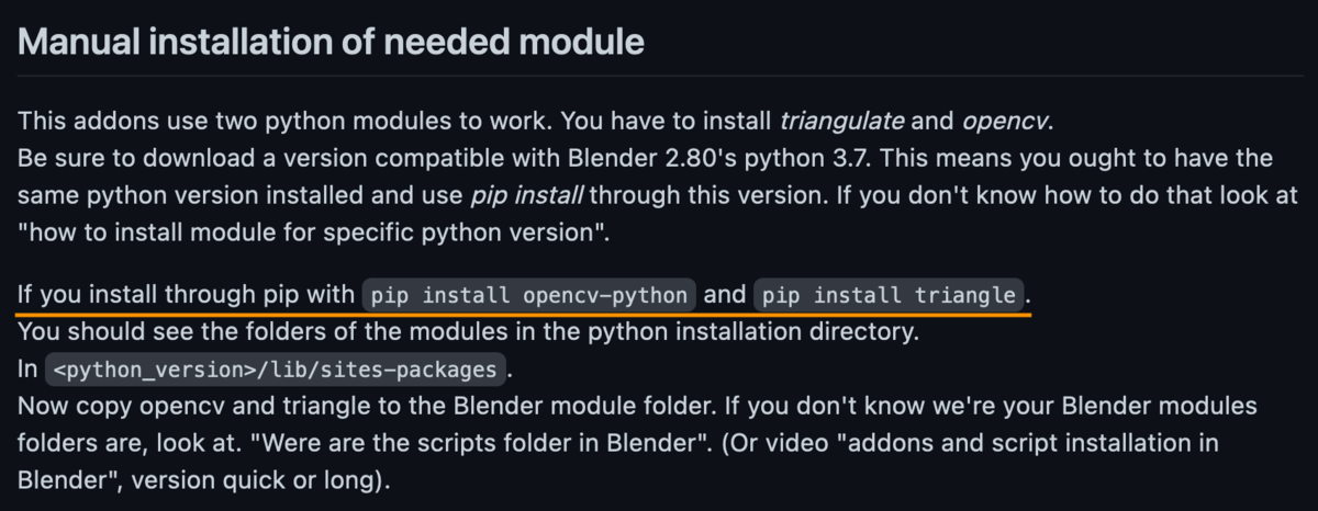 Tesselate texture planeのReadmeではpip install <module name>でインストールするように案内がありますが、環境によってはBlenderが使用しているPythonでモジュールを認識しません。