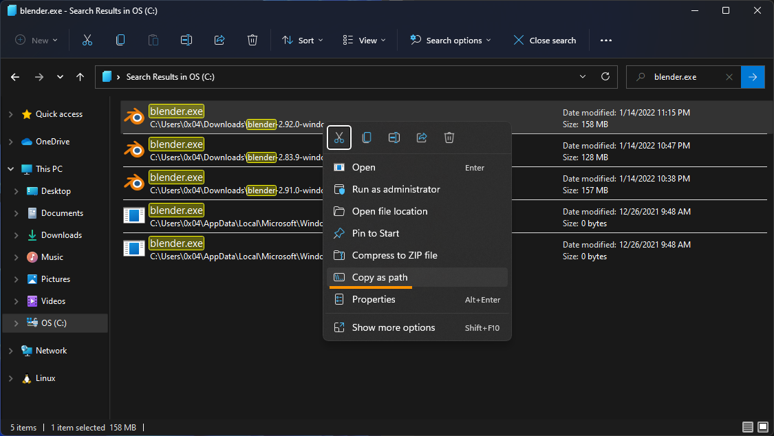 blender.exeをShiftキーを押しながらクリックし、Copy as PathをクリックすることでクリップボードにPathを保存できます