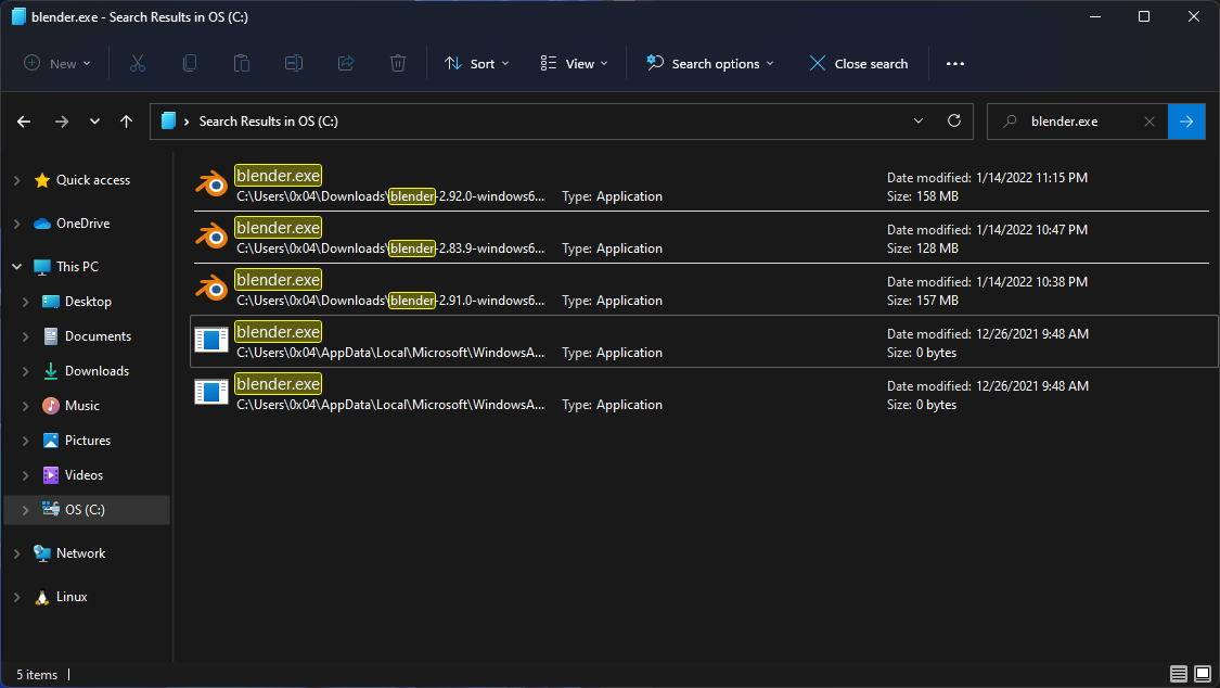 blender.exeと入れると検索できます- ディスク内のファイルを順番に確認していくため検索にはある程度の時間がかかります