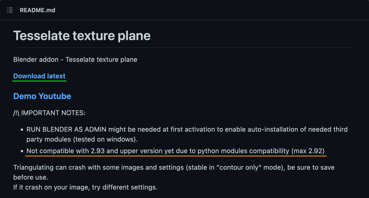 アドオンのWarning欄及びTesselate texture planeのReadmeに注意事項が記載されています。