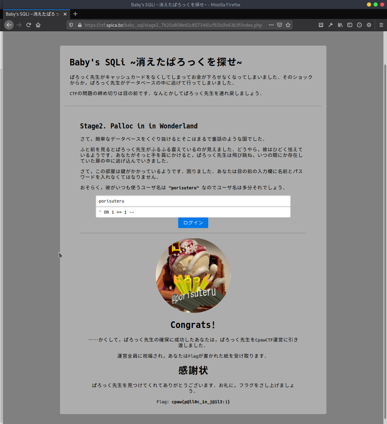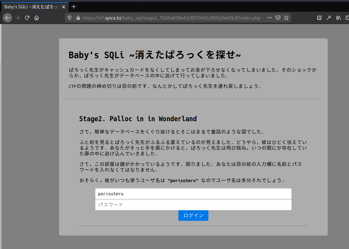 “Baby’s SQLi - Stage 1 -” で入手したURLにアクセスする。